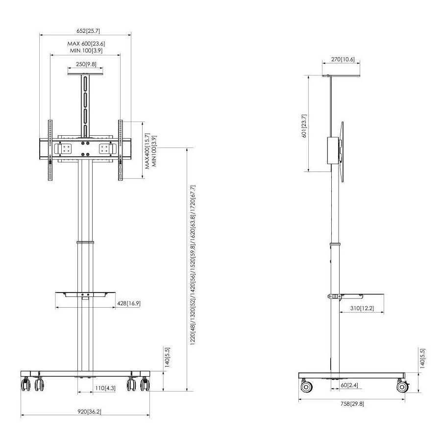 - Κατάλληλη για οθόνες με μέγιστο VESA 600 x 400 mm και δυνατότητα φόρτωσης έως 50 kg, αυτό το τρόλεϊ προσφέρει σταθερότητα και αξιοπιστία.