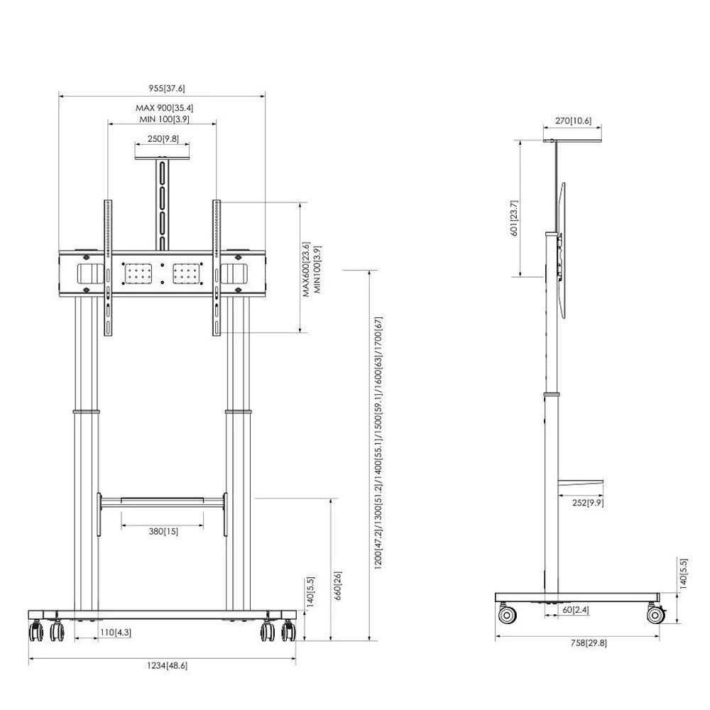 - Κατάλληλη για οθόνες με μέγιστο VESA 900 x 600 mm και δυνατότητα φόρτωσης έως 100 kg, αυτό το τρόλεϊ προσφέρει σταθερότητα και αξιοπιστία.
