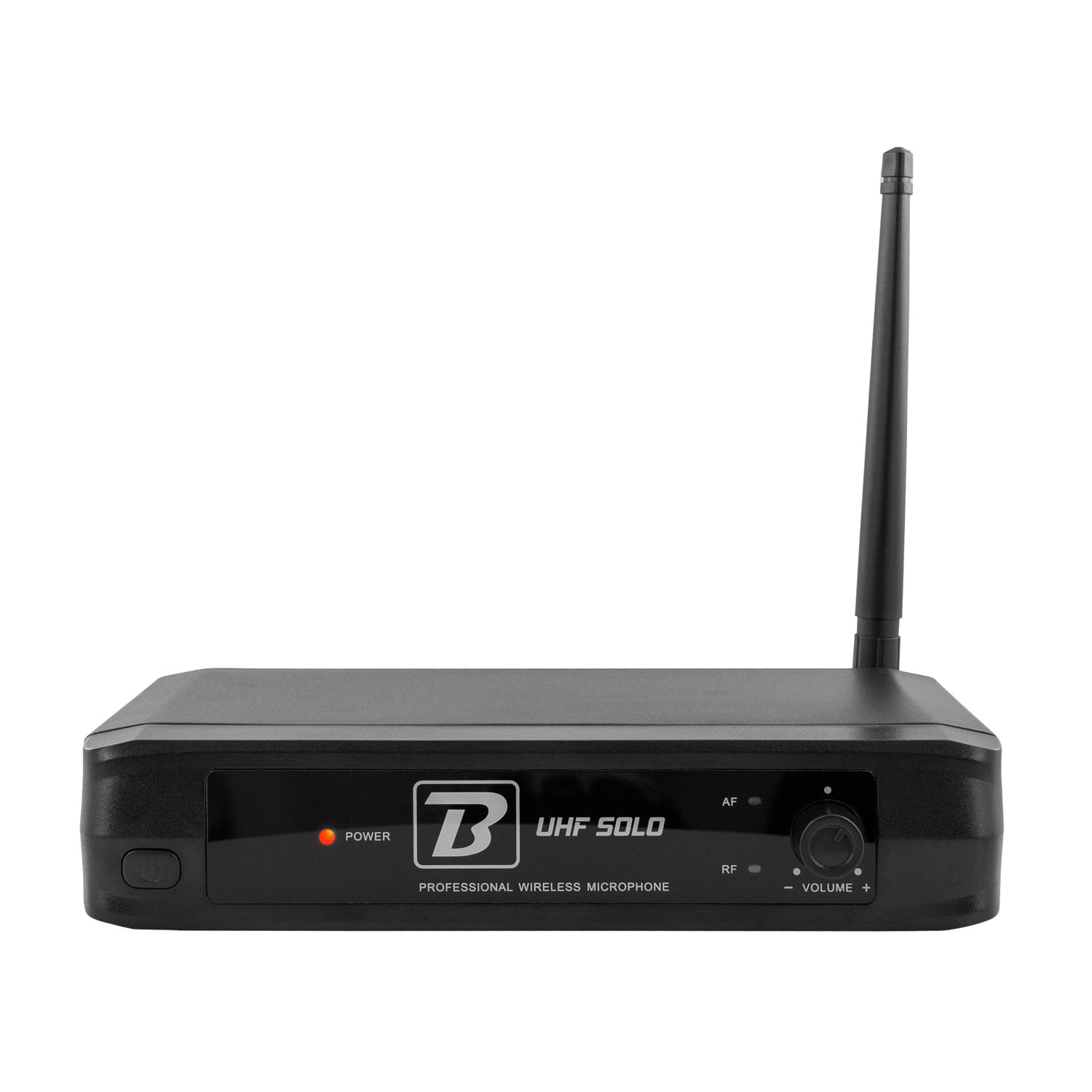 The BoomTone DJ UHF Solo F1 is a wireless handheld microphone system operating in the UHF frequency band, specifically at 663.5 MHz. It includes a receiver and a handheld microphone, making it ideal for presentations, karaoke, and other vocal applications.