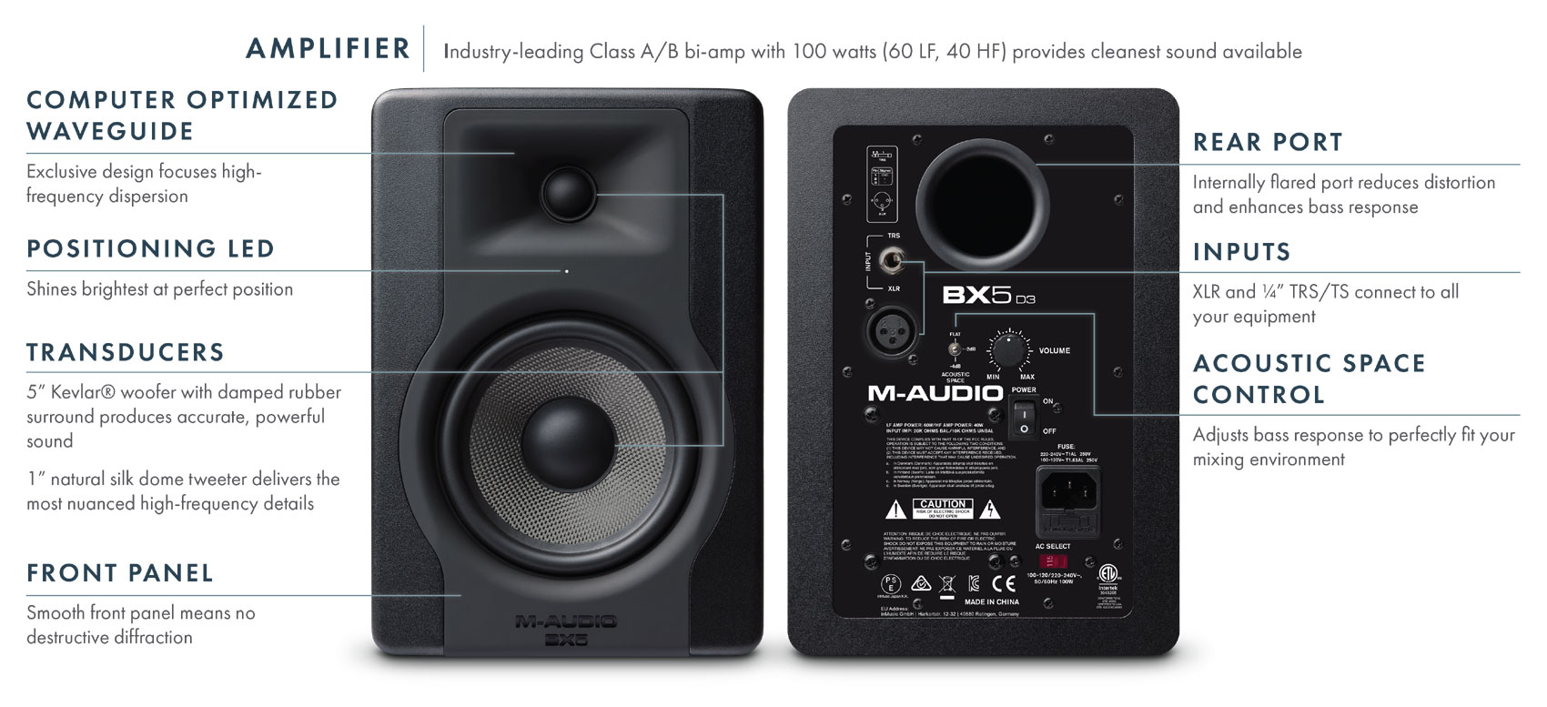 Επαγγελματικά bi-amplified nearfield monitors δύο δρόμων με kevlar woofer 5 ιντσών και tweeter μαλακού θόλου 1 ίντσας.