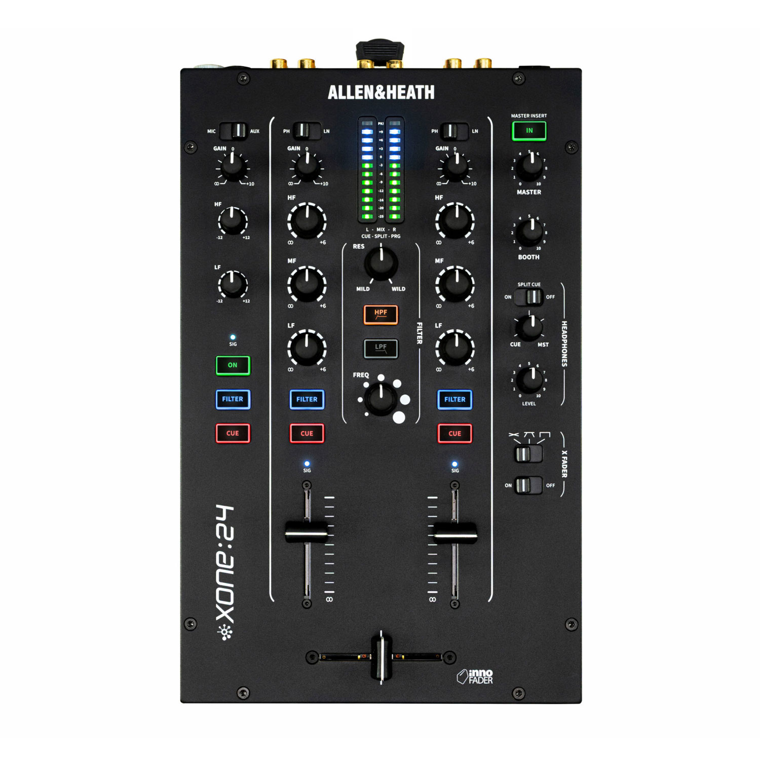 Incorporating a filter design inspired by Allen & Heath’s flagship Xone mixers, the Xone:24 includes an iconic Xone:VCF for creative and precise sound shaping, offering low-pass and high-pass modes, frequency sweep, and the renowned mild-to-wild resonance control.