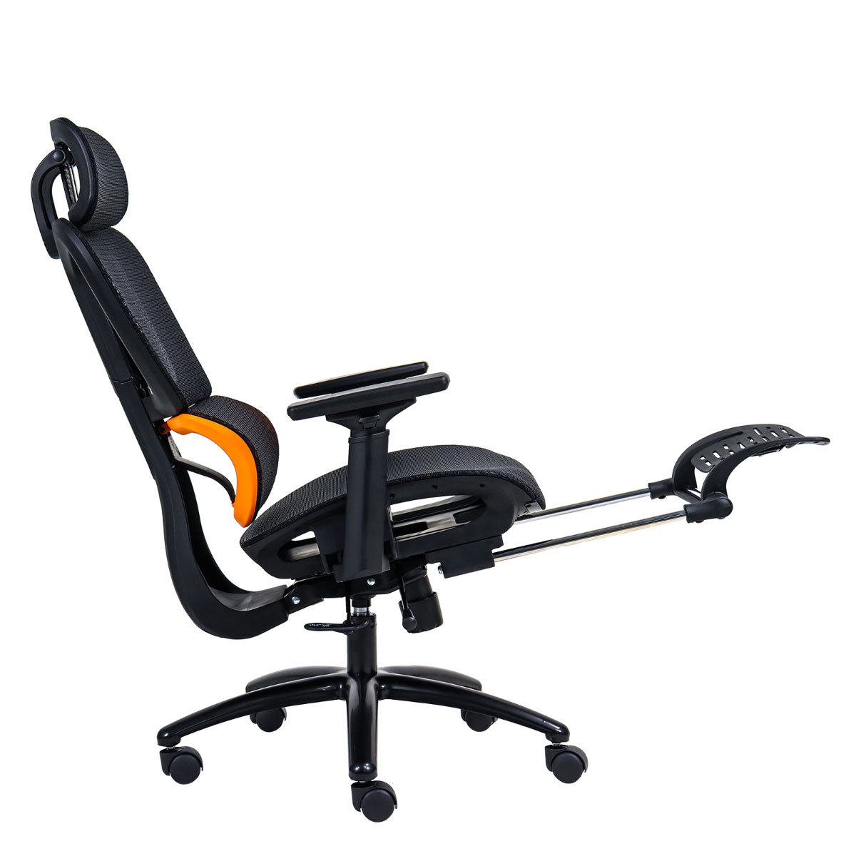 Ergonomic chair in black and orange with adjustable height, reclining function up to 180°, extendable footrest, adjustable armrests, and a frame with 19 support points for stability.