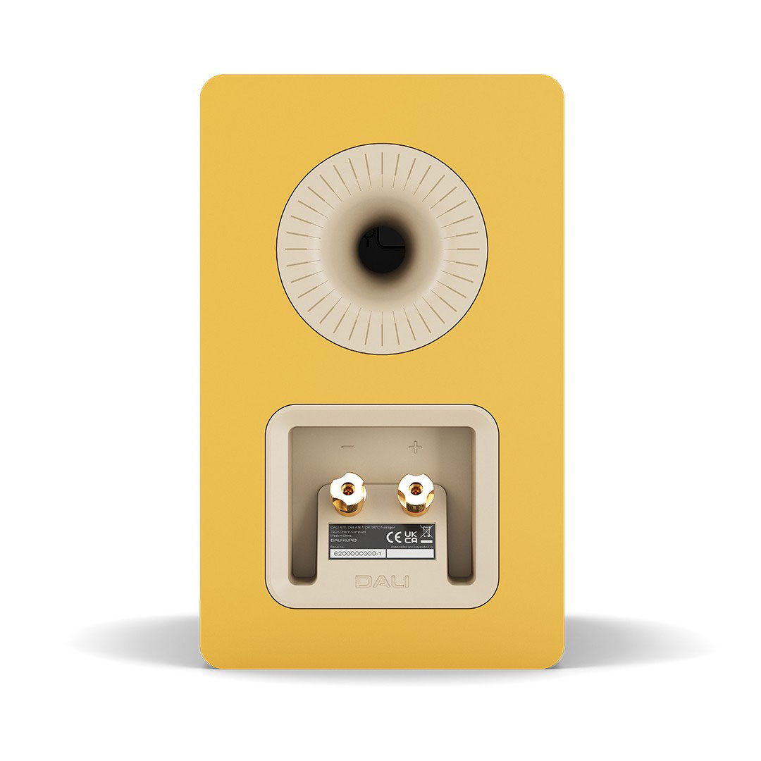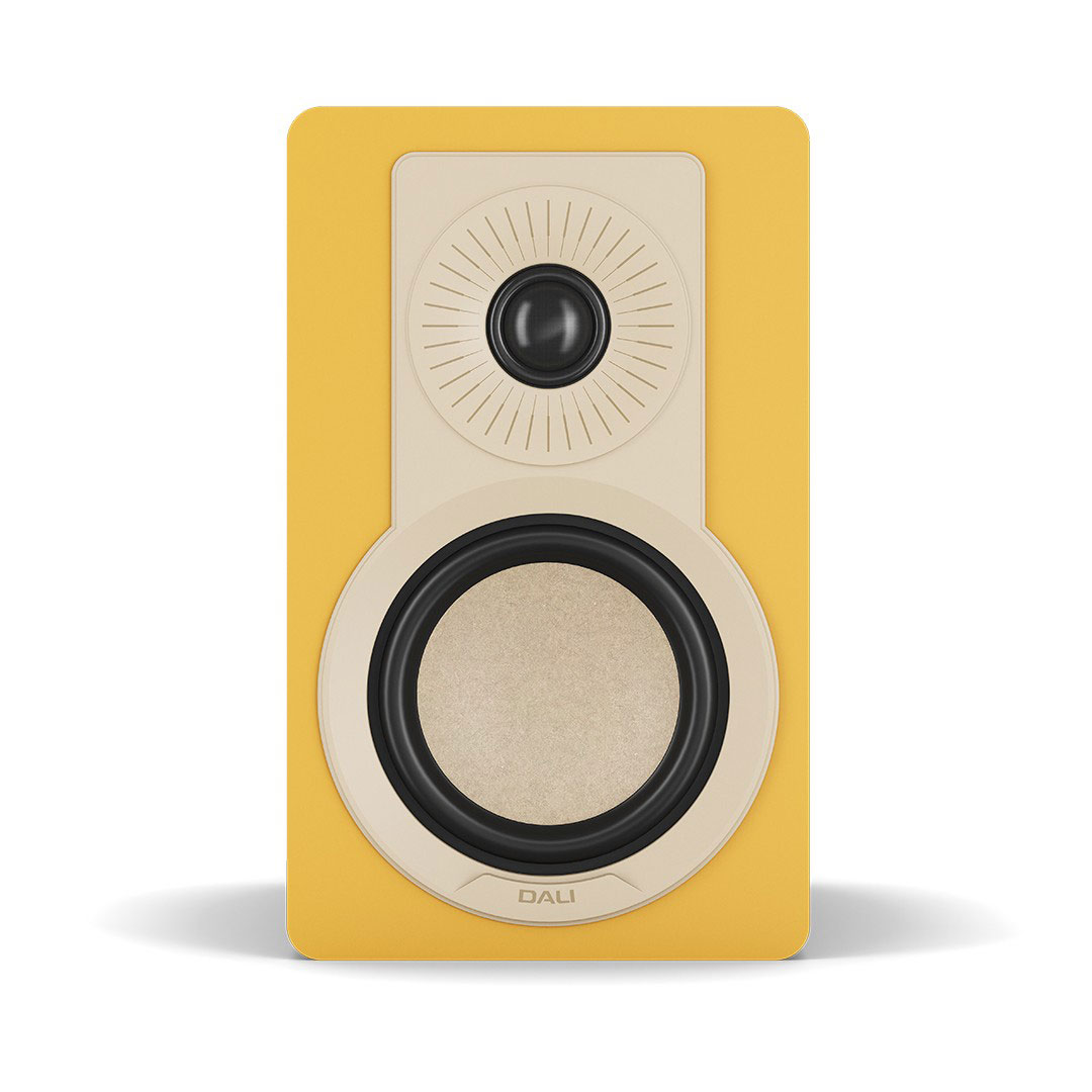 • Elegant pair of speakers with rounded edges, in Golden Yellow finish